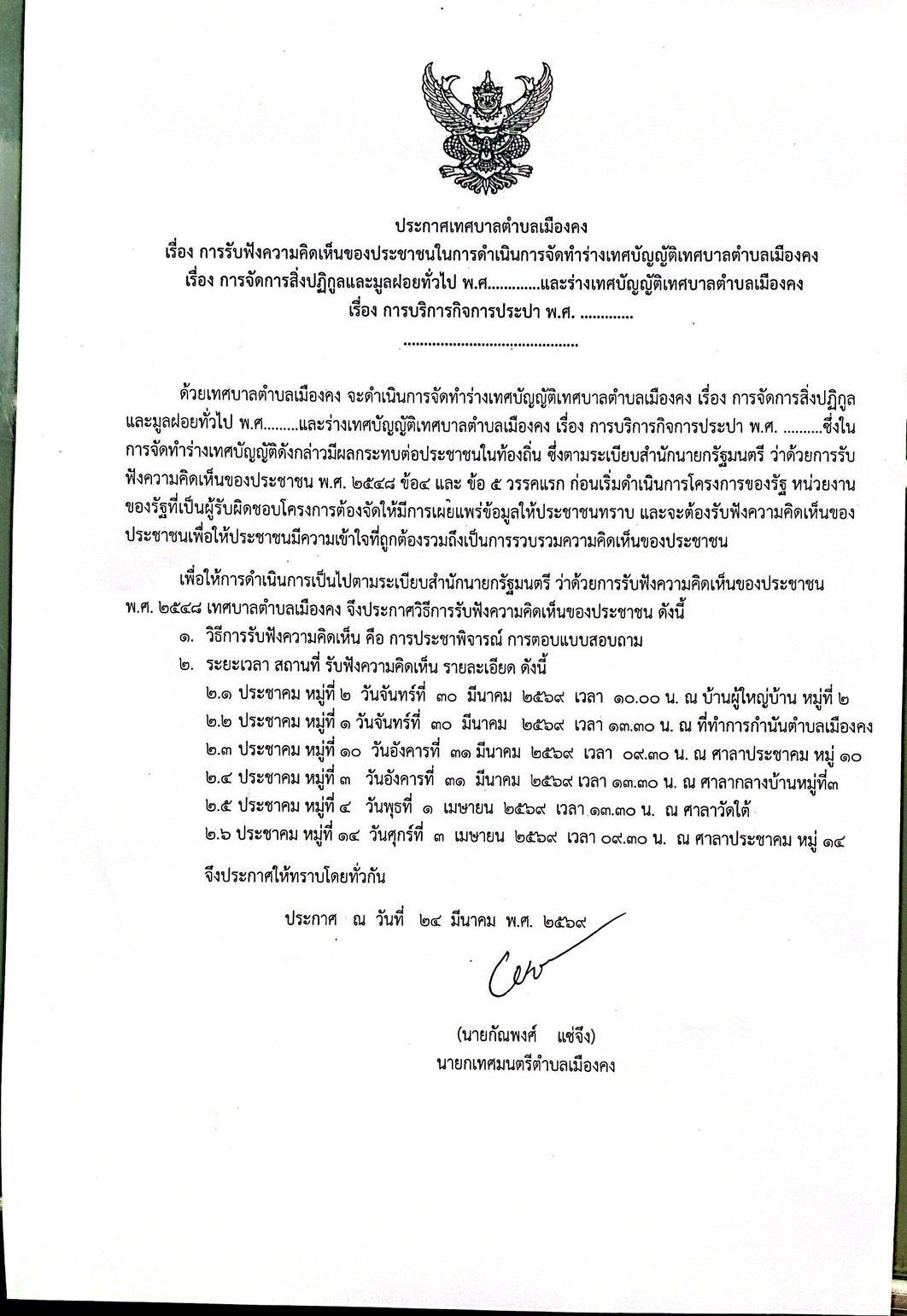 ประกาศเทศบาลตำบลเมืองคง เรื่องการรับฟังความคิดเห็นของประชาชนในการดำเนินการจัดทำร่างเทศบัญญัตเทศบาลตำบลเมืองคง