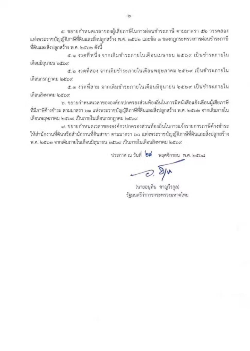เรื่อง ขยายระยะเวลาในการดำเนินการจัดเก็บภาษีที่ดินและสิ่งปลูกสร้างประจำปี พ.ศ. 2569