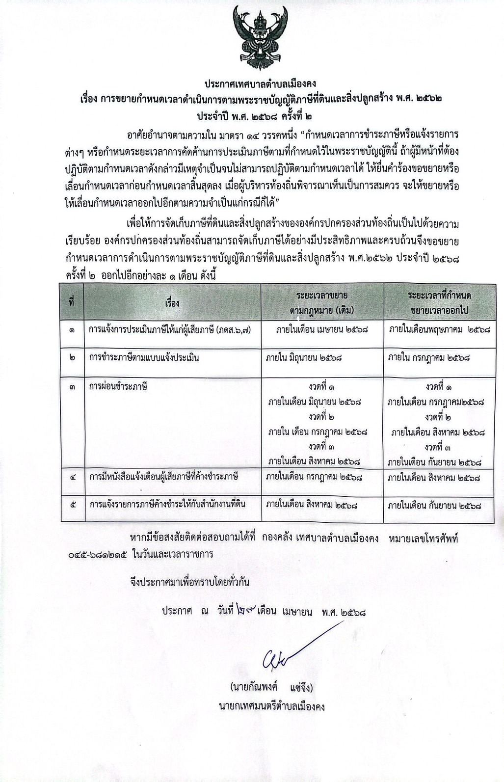 ประกาศเทศบาลตำบลเมืองคง เรื่องการขยายกำหนดเวลาดำเนินการตามพระราชบัญญัติภาษที่ดินและสิ่งปลูกสร้าง พ.ศ. 2562 ประจำปี พ.ศ. 2568 ครั้งที่ 2